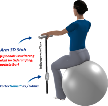 Armtraining mit dem Arm 3D Stab und dem CortexTrainer®RS / VARIO zielt darauf ab, die Funktion des Arms nach Verletzungen oder neurologischen Erkrankungen zu verbessern und spezifische Arm-Fähigkeiten und motorische Fähigkeiten durch repetitives, aufgabenorientiertes Üben wiederherzustellen und zu verbessern. Ziel ist die Steigerung der Bewegungskontrolle, Präzision und Kraft für den Alltag. Speziell für Patienten mit leichten bis mittelschweren Einschränkungen. Es trainiert gezielt motorische Fähigkeiten wie Schnelligkeit, Geschicklichkeit, Präzision und die Fähigkeit, den Arm korrekt zu führen. Auch für Patienten mit schweren Lähmungen, um alle Bewegungen des Arms systematisch und wiederholend zu üben, einschließlich der Schulter. Repetitives Üben: Durch die Wiederholung werden neuronale Verbindungen gestärkt und die motorischen Fähigkeiten verbessert.